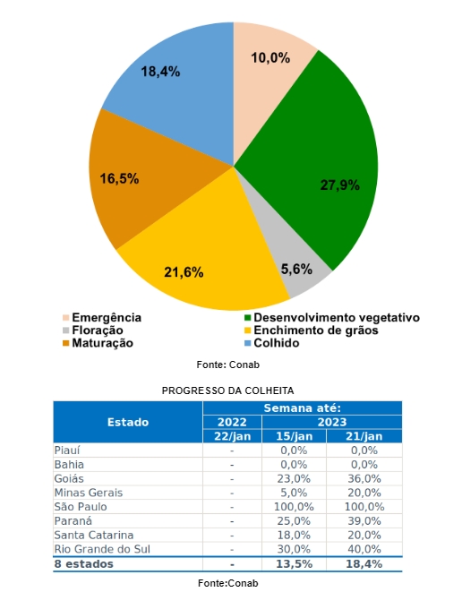 Mesmo com o excesso de chuvas, Minas Gerais teve um avanço de 15% na colheita, em comparação ao último monitoramento, atingindo 20% da área colhida até o dia 21 deste mês. Esse excesso de chuvas, trouxe algumas perdas pontuais. Mas, de maneira geral, as lavouras vêm apresentando boas condições.