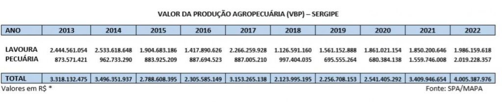 Dessa publicação extraímos que o VBP Sergipano de 2022 foi de R$ 4.005.387.976,00, ou seja, o maior dos últimos dez anos.